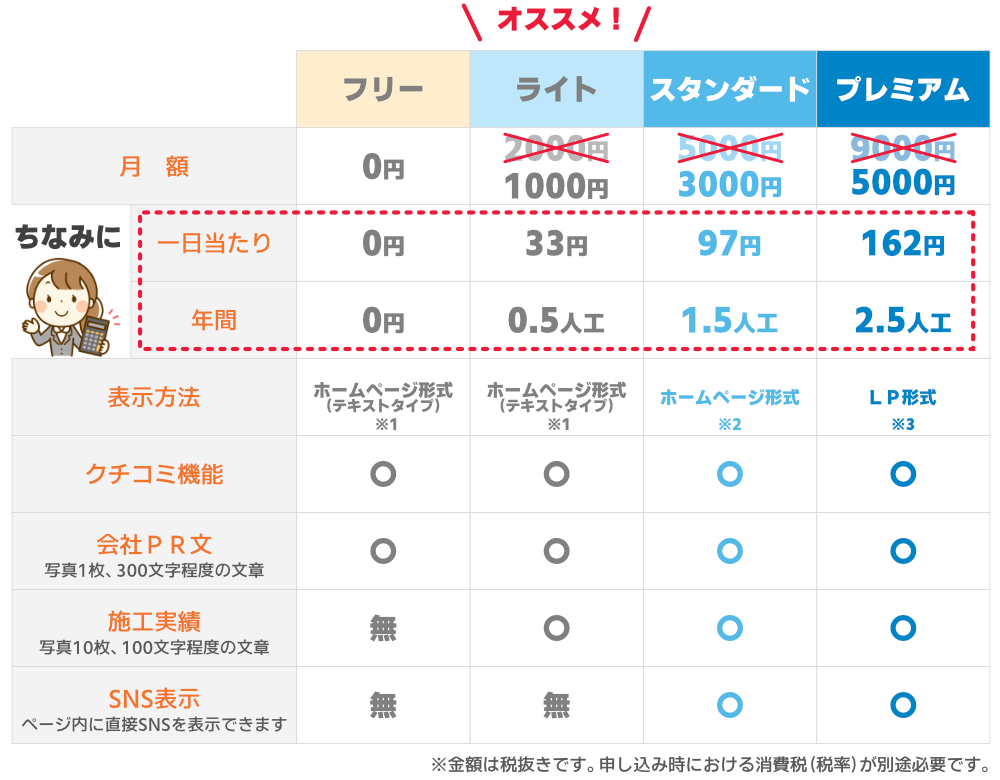 ※3 プレミアムプランは貴社LPデータをお持ちの方に限ります。ただ、ぬりラボで有料にて代行製作することも可能です。その場合はお問い合わせください。